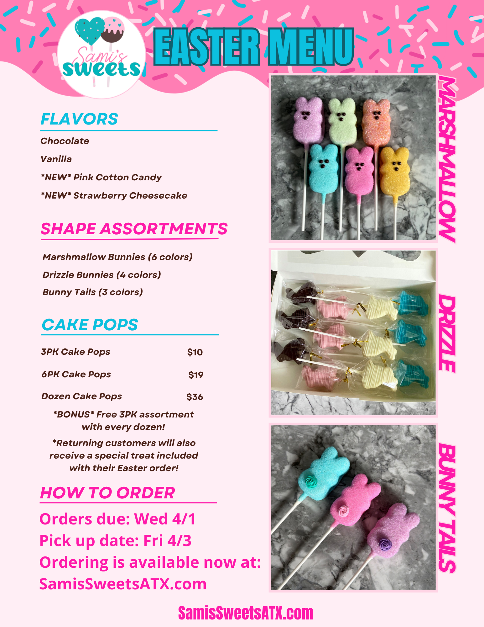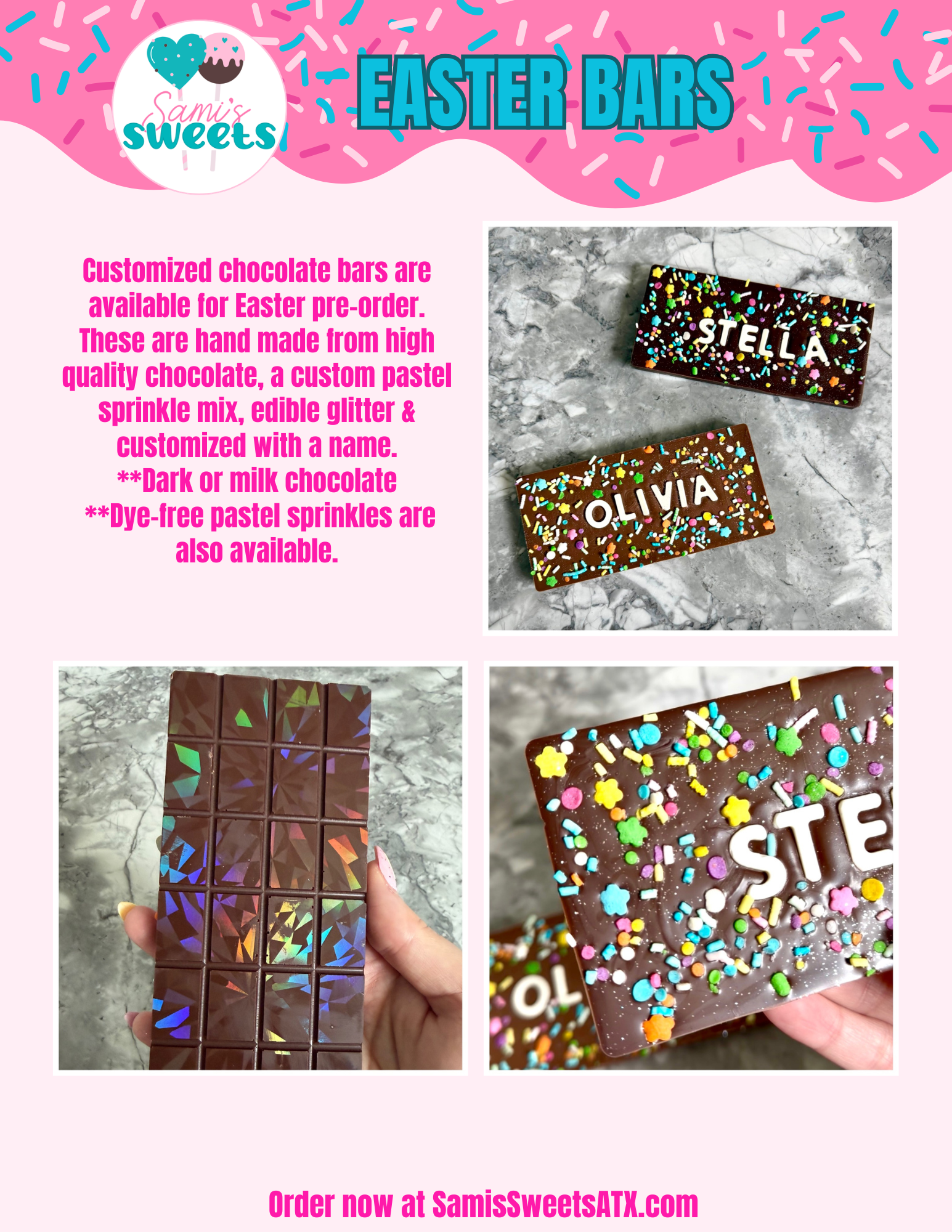 Easter is almost here! Shop your favorite Easter treats. Pre-orders are due by Wed 4/1. Pick up will be Friday 4/3. I’m offering cake pops, cookie cakes, and custom chocolate bars. And I am introducing some brand new delicious flavors!