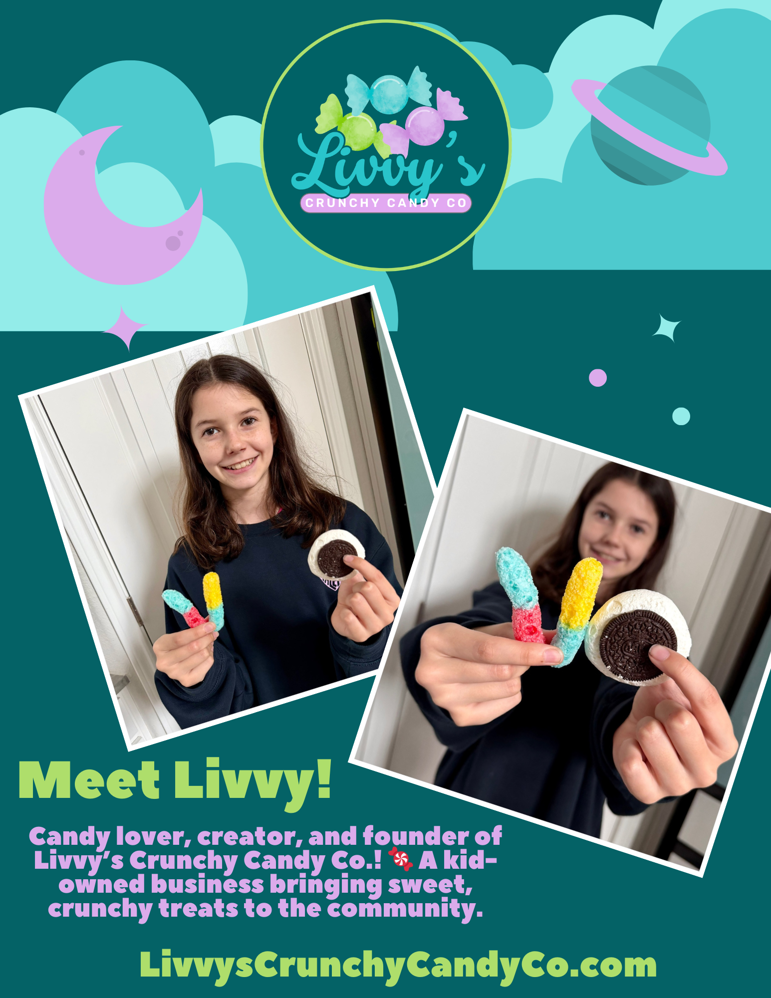 Livvy is my oldest daughter who’s a 5th grader. She has been dreaming about starting her own freeze-dried candy brand, and we’re so excited to finally launch it. She’ll be starting with a couple of crunchy candy options at first, with more treats and flavors being added as she grows her menu.